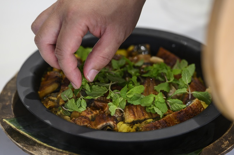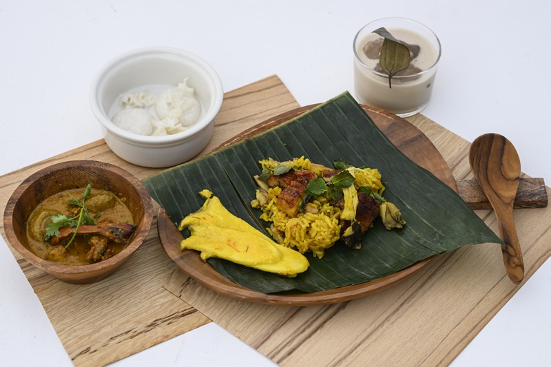 鍋が沸騰したら弱火にして10分炊いた後、火を止めて10分蒸らして完成。仕上げにミントを散らしていただきます。木の子のまろやかな味わいとうなぎの蒲焼の甘味で、スパイスを使っていてもやさしい味わいのビリヤニは家族でも食べやすそうなひと皿でした。