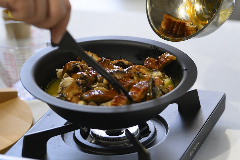 「今回はうなぎの蒲焼きを使っていますが、さっぱりと食べたい場合は白焼きでも良いです。スパイスについては、シナモンスティックはマストではないのですが、うなぎの土臭さが消えるのでおすすめです。最後に加える太白ごま油も入れなくても問題ありませんが、加えることでお米がコーティングされてよりパラッと炊けますよ」