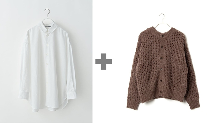 「ル・ピボット」から今季登場した120/2 シャツは、大きすぎず、タイトすぎず絶妙なサイジング。1枚で着ても格好よく決まりますが、すっきりとしたデザインなので、ニットやワンピースとの重ね着にも重宝します。羊毛を使用したワッフル編みがかわいい「プリット」の2ウェイカーディガンと合わせれば、ぬくもりのある秋らしい着こなしに。シャツの裾やカフスの出し方で、自分らしいスタイルを見つけたいコーデです。こちらのカーディガンはボタンを後ろにして着ることもできるので、様々なスタイルを楽しめますよ。
