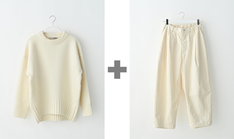 袖口と裾の太めのリブがポイントの「ル・ピボット」のヤサンシルククルーネックは、シンプルなデザインでパンツにもスカートにも合わせやすく、何年後も活躍してくれること間違いなしの一着。ベーシックなお役立ちニットには、同じく白系のパンツを合わせてワントーンコーデを組んでみました。 「マスノウデザイン」が作るドブレパンツは「大人になったら、着たい服 ONLINE STORE」でも大人気のアイテム。二枚仕立てになっているので、生地と生地の間に空気の層ができ、保温性バツグン! 秋冬は暖かく、春夏はサラッと、一年中はける便利アイテムです。その日の気分でインナーやスカーフ、くつ下などでアクセントカラーをプラスして、おしゃれを楽しみたいコーデです。