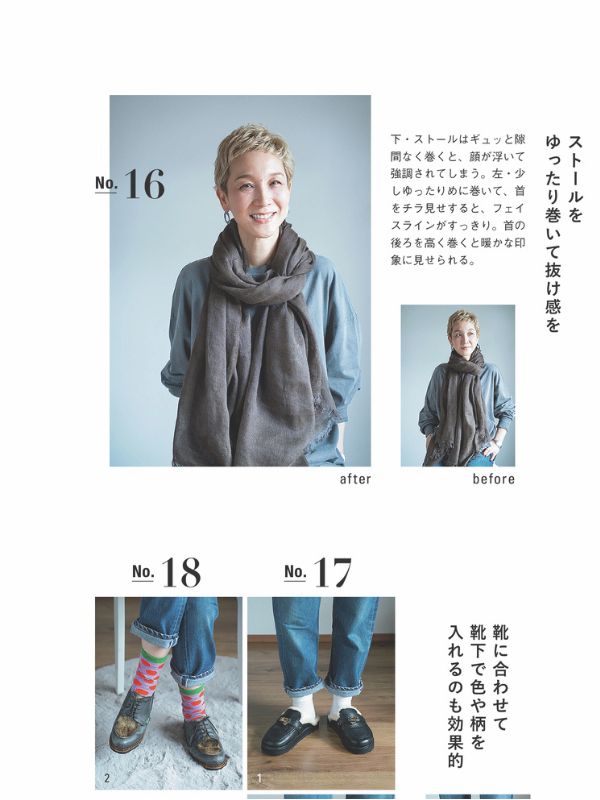 どんなに素敵な服でも、ただ着るだけではもう一つおしゃれになりきれないのが、ファッションの奥深いところ。おしゃれに大事なのは「抜け感&こなれ感」。ストールの巻き方ひとつ、シャツの襟の抜き方ひとつで、同じ服ががらりと違って見える。そんな「着こなし」のテクニックもじっくりと解説しています。