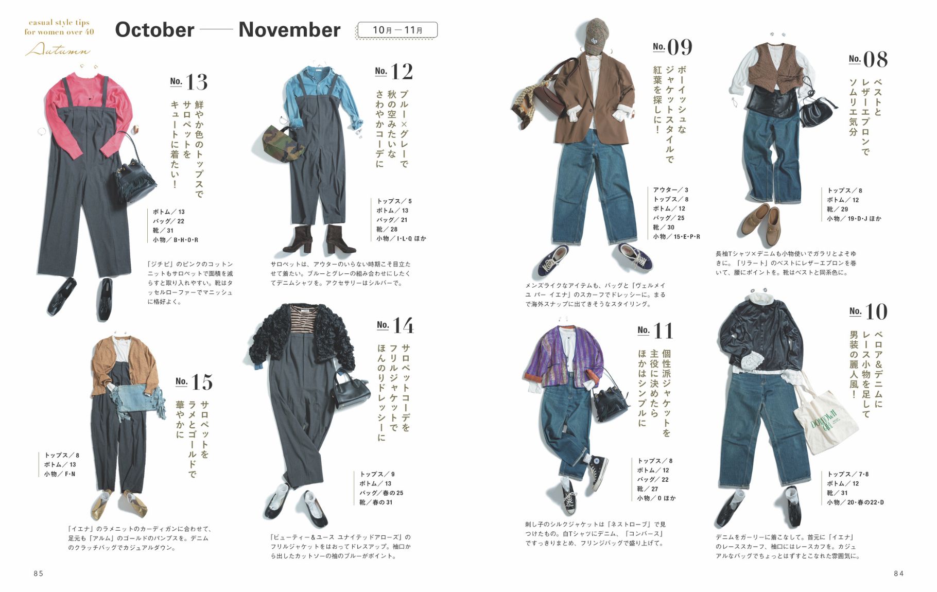 ベーシックな基本のアイテムを中心に、応用アイテムを加えながら、コーディネートのアイデアをたっぷり掲載しています。組み合わせのヒントとしてはもちろん、トップスをインして着るのか、アウトにするのか、バッグやジュエリーの組み合わせ案まで網羅。カジュアルななかでも、コンサバ風、カジュアル度高め、ラグジュアリー見え、ロックな雰囲気など、テイストも様々。たとえば、「今日はデニムの気分だけど、トップスやアウターは何を合わせよう?」というとき、いくつものデニムのコーデからヒントがもらえたり、自分の好きなスタイルのコーデを真似したり。幅広く応用ができるラインナップになっています。