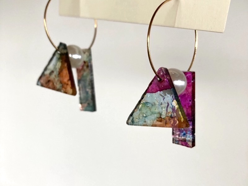 私が特に気に入っているのが、「しらたま」シリーズ。アクリルの2枚の板に、白玉を連想させるパールがはさまれているフープピアス/イヤリングです。ゆらゆらと揺れる白玉とアクリルは、光の当たり方や反射によってさまざまに姿を変え、いくつもの表情を見せてくれます。