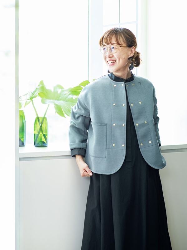 「今回はクラシカルなダブルブレストのデザインに。これまでより着丈を少し短くして、スカートにもパンツにも合わせやすいバランスに仕上げました」と馬場さん。