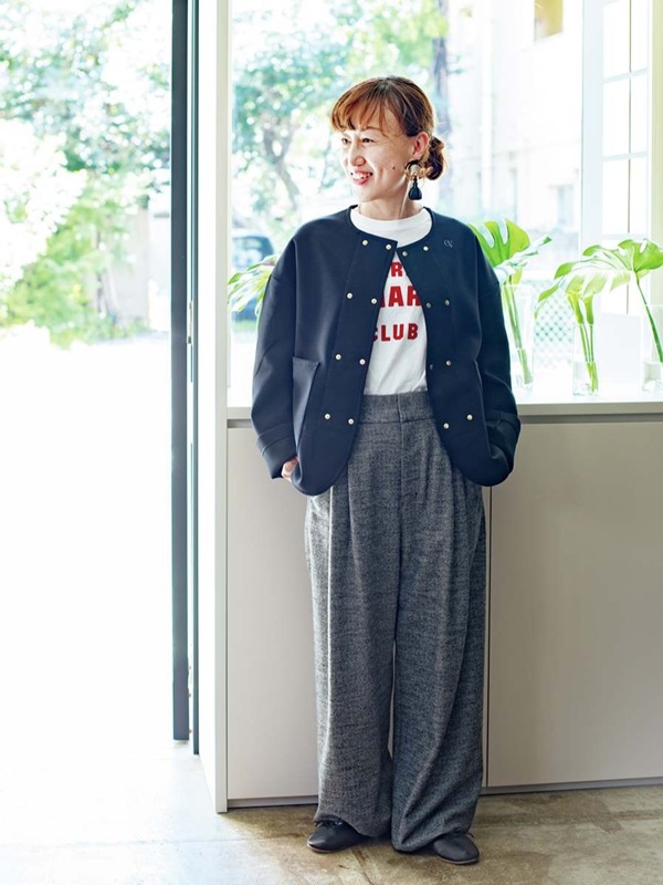 ユニセックスなゆとり感のサイズ44を、パンツスタイルに合わせてハンサムな装いに。
