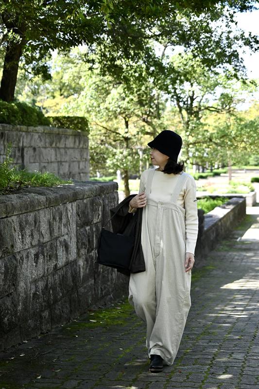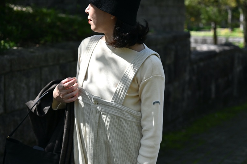 この日は生成りのカットソーに、同じく「YARMO」のコーデュロイサロペットを合わせて。