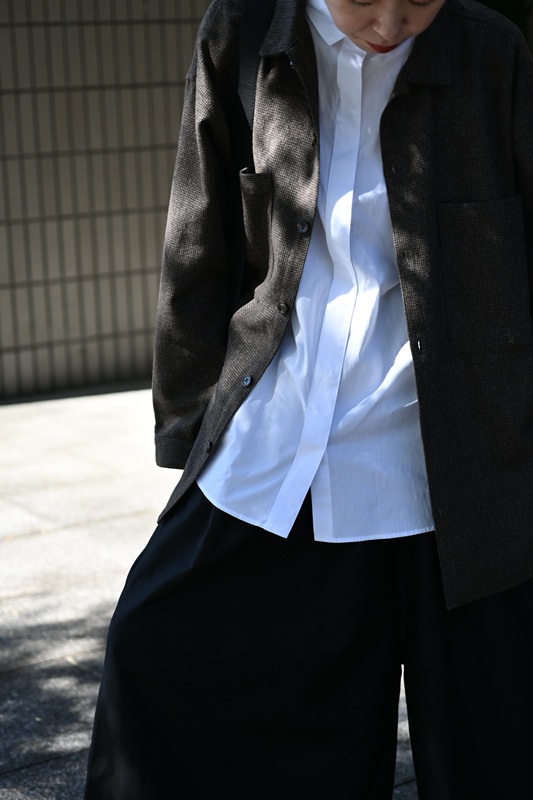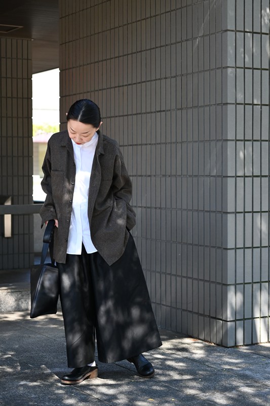 美術館へ行く日のコーディネートは、少し“清楚”なムードにまとめて。ウールのシャツをジャケット代わりにさらりと羽織って。