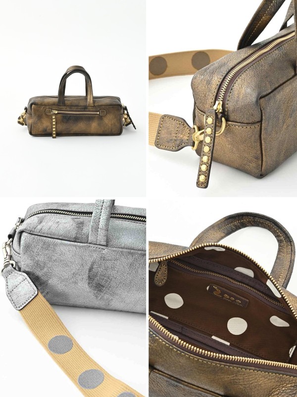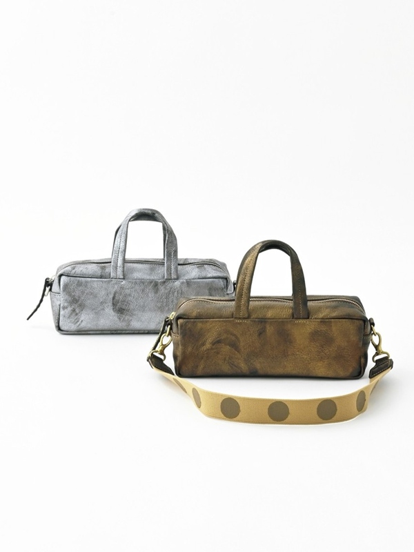 小技の効いたデザインと見た目以上の収納力が大好評の「ドゥミル」のバッグ。取りはずし可能なショルダーストラップつきの横長ボストンも、入荷するたびに反響を呼ぶ人気の形。今回は、メタリックカラーにムラ加工を施した羊革素材がお目見え。