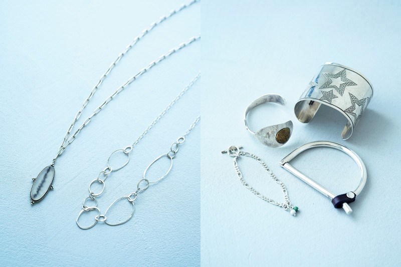 (右)星模様のバングルはナバホ族のもの。D字形のバングルは「シーエックスシー」、スプーンのバングルは「アトリエ・ダンタン」、ハウライトとターコイズをあしらったブレスレットは、古賀さんのオリジナルブランド「コム」の新作。(左)チェーンネックレスと、植物が閉じ込められたような模様の入ったメノウをトップにつけたネックレスは、ともに「アートジュエリー マーブル」。
