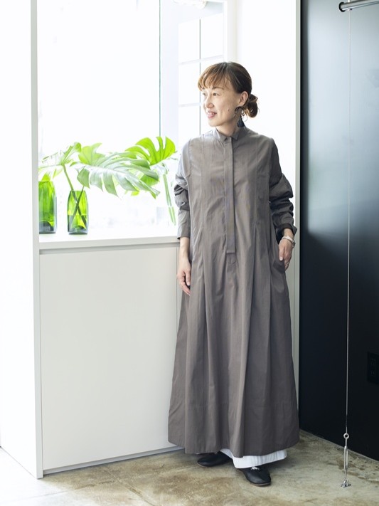 「いくつものタックを施すことで、ほどよいボリューム感と動きのあるシルエットを実現しました。フォーマルなウィングカラーが引き締め役の、一枚で主役になるワンピースです」と馬場さん。