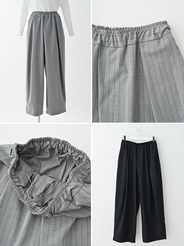 ウエストはゴム仕様で、ドローストリングで調整が可能。マニッシュなステッチストライプが装いのアクセントに。