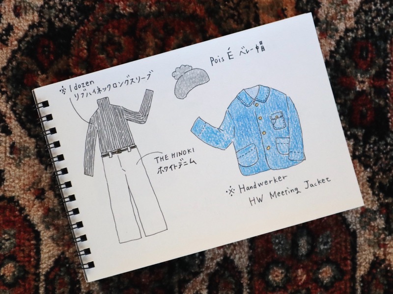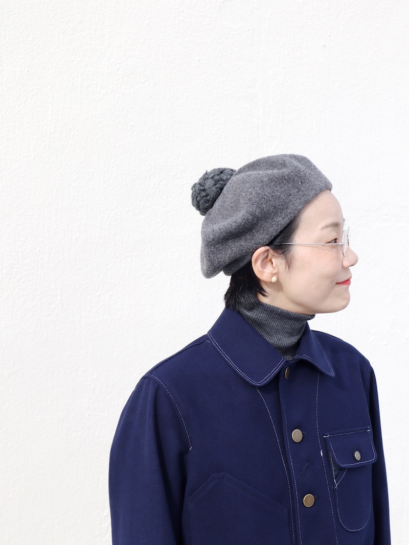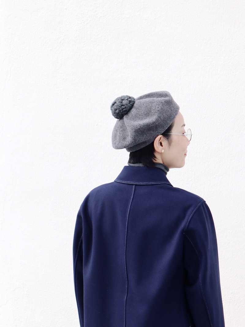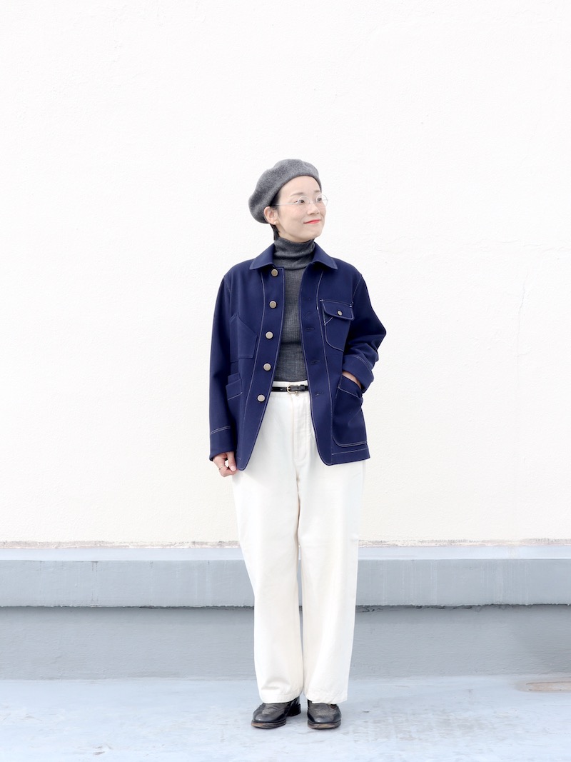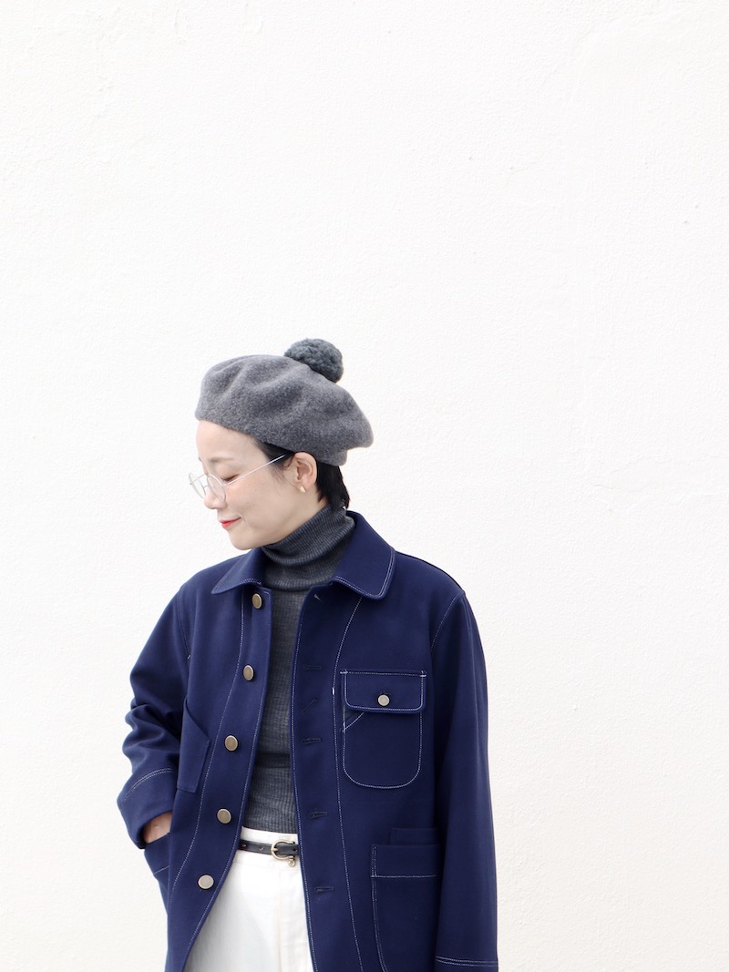 秋空のような藍×白の爽やかさに、ホッコリとした素材感のベレーとタートルを合わせ、晩秋の季節感を意識しました。