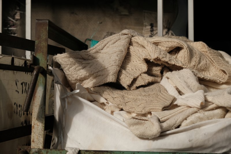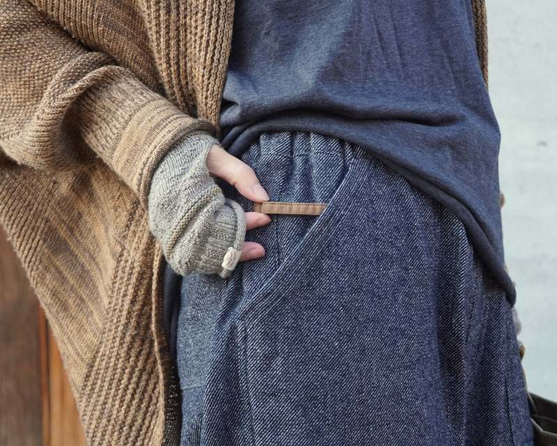 毛七WOOLは、愛知県一宮市を中心にした尾州産地で、今から60年前から作られている再生WOOLです。生地の端材や古着のセーターなどを集め、色ごとの仕分けをして、わたに戻し、そこから糸にしていく。再度染色を施さない為、環境負荷も少なくなります。とても手間はかかりますが、貴重な羊毛を無駄にしないように先人の知恵が詰まった尾州ならではの技術。そんな毛七デニムは独特のニュアンスのある色で、軽くて内側がふんわりした柔らかさ、そしてやっぱりあたたかい!!