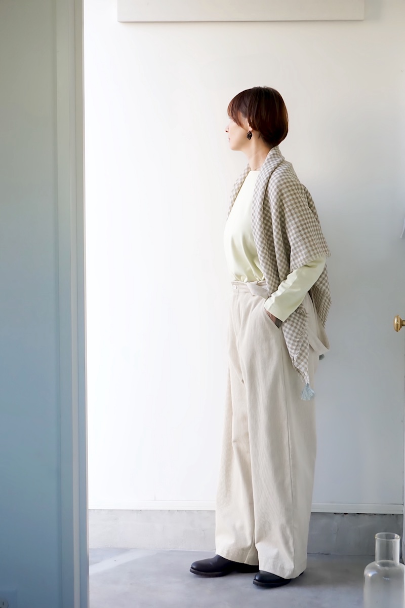 コスモス × グリーンアップルは冬の白い光にやさしく映えます。こちらはボートネックのレギュラーサイズ4。