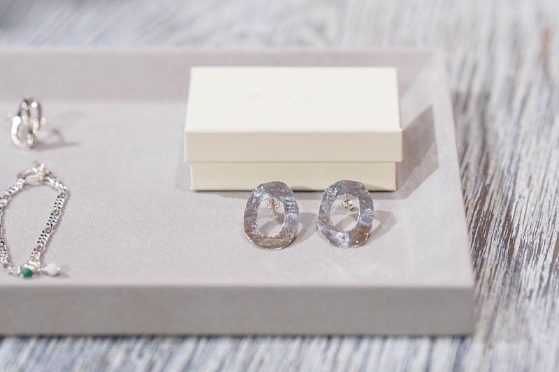 本の中でも、ヘビロテで登場する「アートジュエリー マーブル」のシルバーOピアス。本の発売を記念して、刻印入りの別注シルバーOピアスを数量限定で作ってくれました。このほかにも、会場では、サテンスカートのコーディネート例も展示。