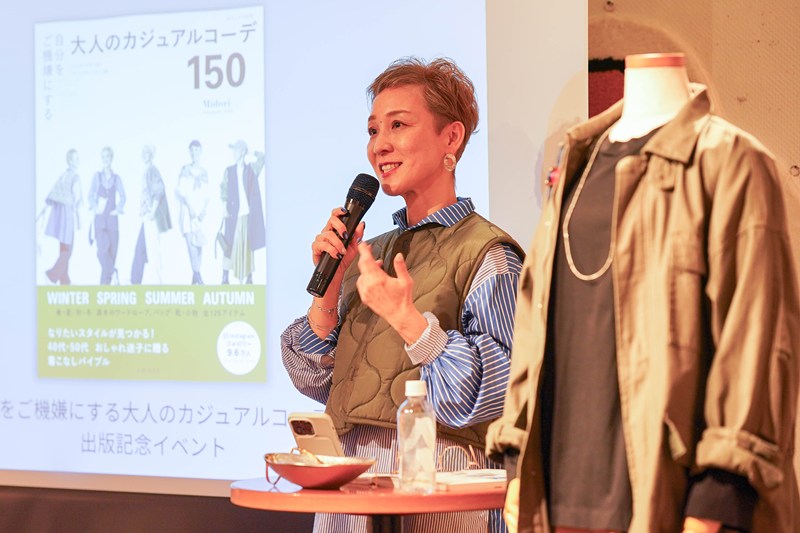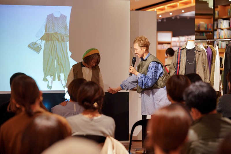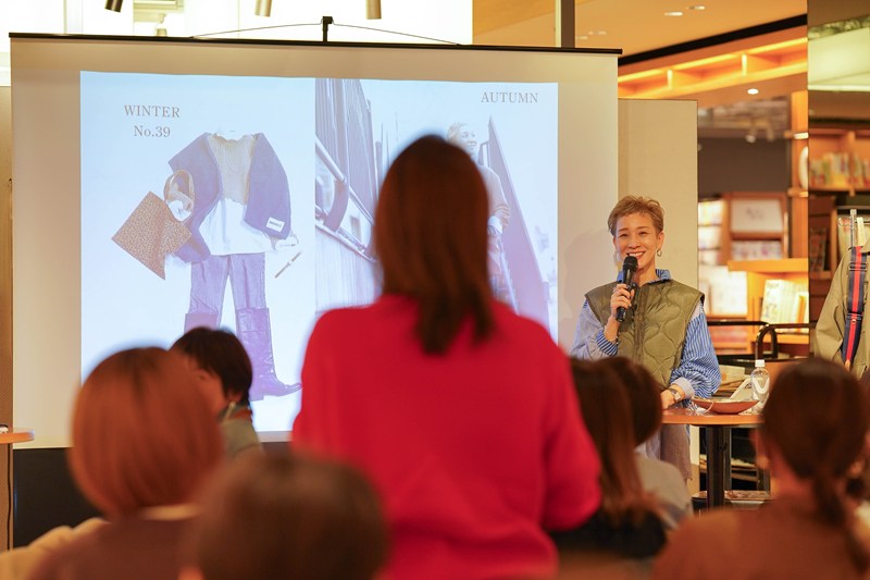 ステージ脇には『自分をご機嫌にする大人のカジュアルコーデ150』に掲載したコーディネートや、冬の基本のアイテムに使用しているロングスリーブシャツ、サテンスカートなどのアイテムを展示。参加者が実物を手にとって見られるように。