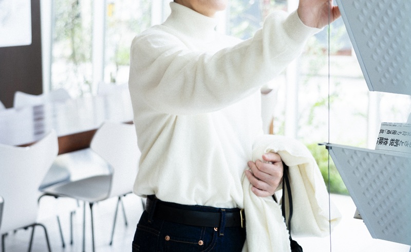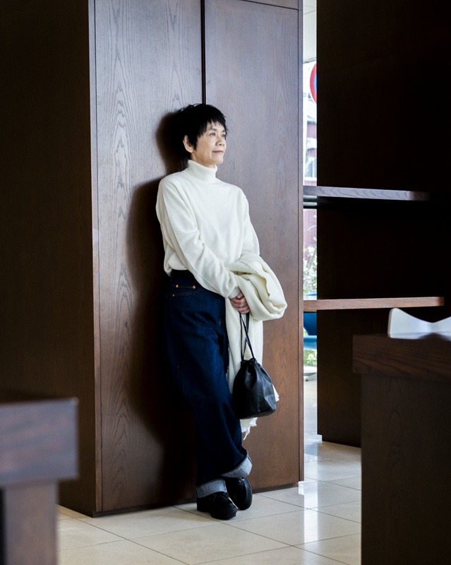 合わせたのは、同じく「ヤエカ」のカシミヤのタートルニット。薄手のカシミヤなので、デニムにインしてみました。カシミヤの白なんて、絶対にナポリタンは食べられないですね(笑)。