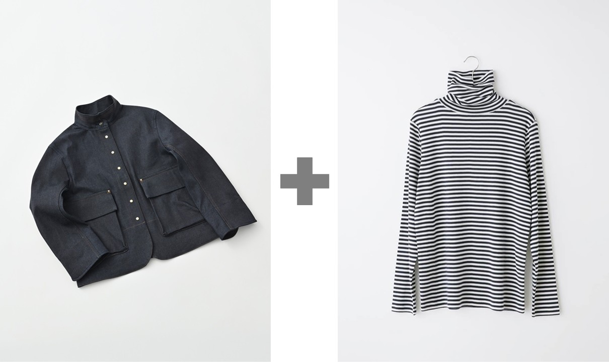 「シュヴァル プラス」のインペリアルカラーのデニムジャケットは、コーデュラナイロンを混紡した生地を使用し、耐久性と軽さを兼ね備えた一着。立ち襟に施されたステッチやアンカーボタンが、ラフになりがちなデニムジャケットを上品に見せてくれます。すっきりしたシルエットだからコートとの重ね着におすすめ。インナーには「パーマネントエイジ」のシルクコットンタートル ボーダーを合わせて冬のマリン気分を味わって