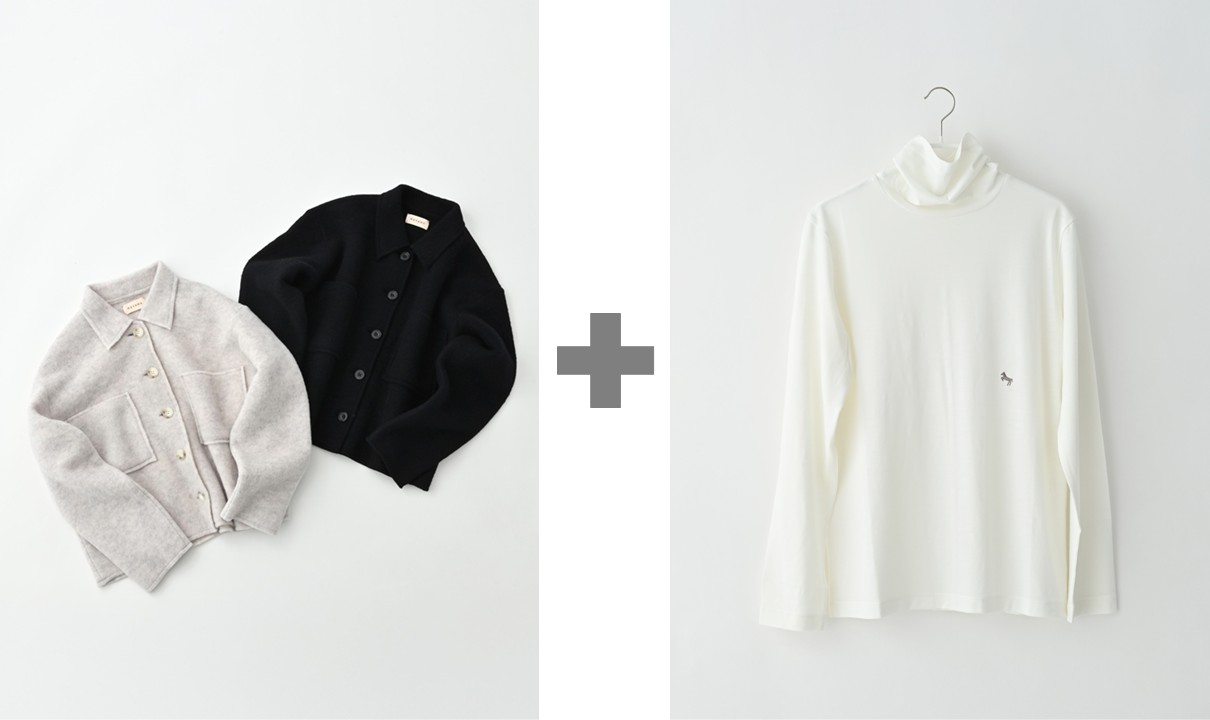 パイル編みの起毛ウール生地でつくられた「メヤメ」のライトウール ショートジャケットは、驚くほど軽くてやわらかな着心地。春先や秋口にははおりとして、冬にはカーディガン感覚でコートと重ねて着られるうれしい一品。ジャケットの下には、着心地ばつぐんのイタリア・レダ社の生地を使用した「シュヴァル プラス」のウールジャージー オフタートルをイン。首元がゆったりとしているので、締めつけ感なく寒さから守ってくれます。