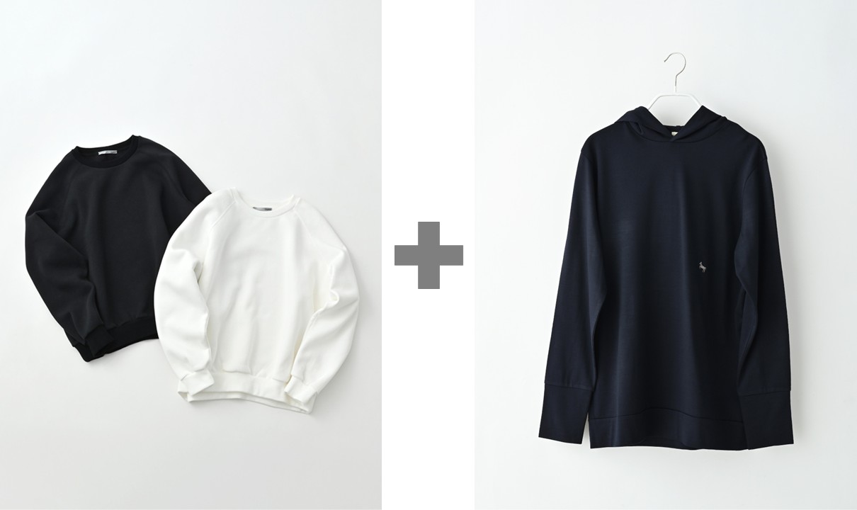 アウター、トップス、インナーと、重たくなりがちな冬の着こなしにおすすめなのが、コットンにポリエステルを混紡することにより軽さと暖かさを実現した「ル・ピボット」のコットンポリエステル クルーネックです。袖山のダーツ処理や、裾口と袖口にギャザーを施すことで着たときの立体感が美しい一着。クルーネックなのでシャツやタートルネックはもちろんですが、「シュヴァル プラス」のウールジャージー フーディの上に着てフードをのぞかせれば、重ね着のアクセントに。薄手のウールジャージー生地なので様々なトップスのインナーとして重宝します。