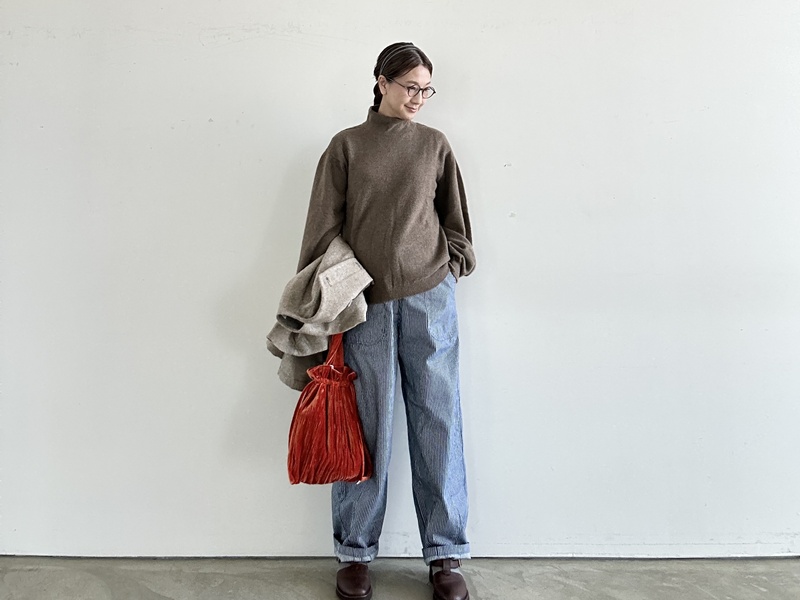 そして冬は、ニットやアウターを重ねて。暖かみのある素材とも相性が良くて、無地のトップスならどんなものでも受け止めてくれます。本当に無地ならなんでも大丈夫、どんな素材でもどんとこい! って感じです(笑)。