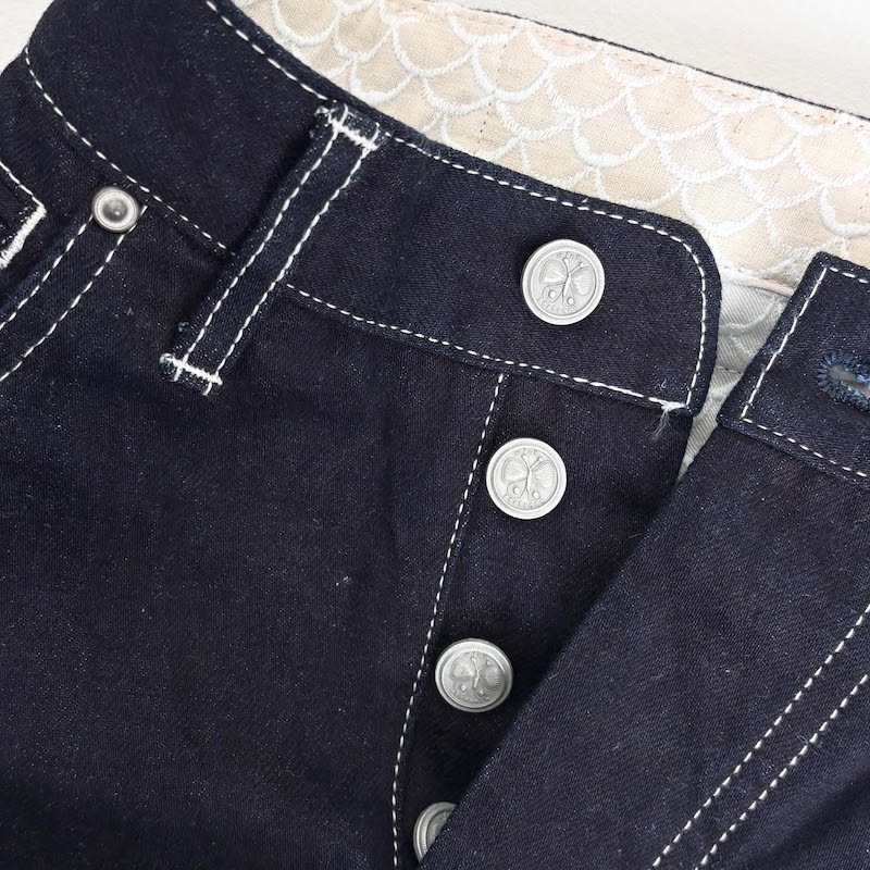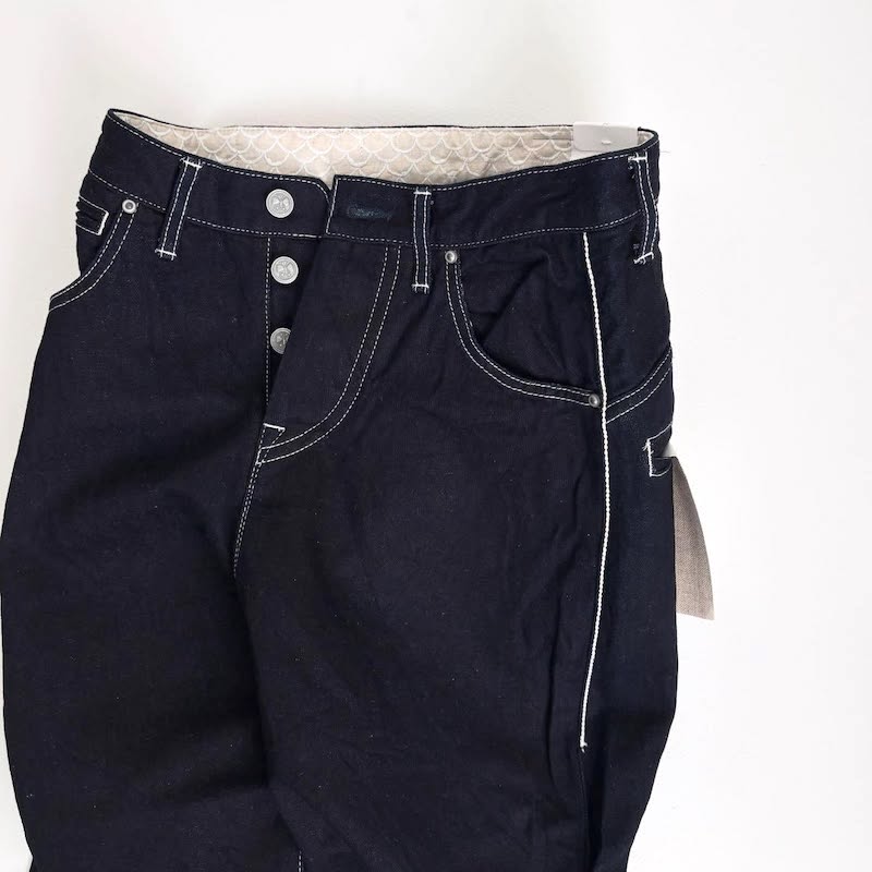 デニムの特徴はリネン糸が織り込まれ、最初のタッチから重すぎず柔らかなはき心地です。オリジナルのチョウチョが刻印されたボタン、両サイドのステッチライン、裾の赤ミミ、ウエスト後とポケットの内側に鱗刺繍のmermaidのテキスタイルが使われています。