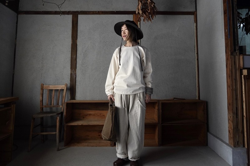 そんなサロペットに今日は尾州(びしゅう)産地の、夏に最適な通気性・吸湿性に優れたWOOL 100%の帽子「ブーニーハット」を組み合わせました。