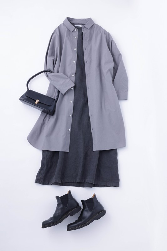 トーンをそろえたチャコールグレーの「エヴァムエヴァ」のリネンワンピースを合わせて。