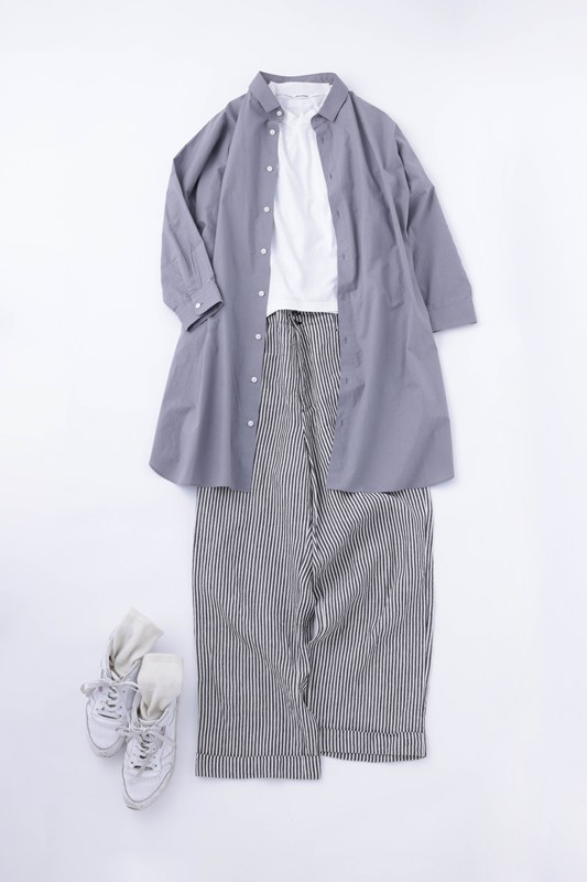 たっぷりとした丈のグレーのロングシャツ+オールドマンズテイラーのストライプのリネンパンツが好相性!