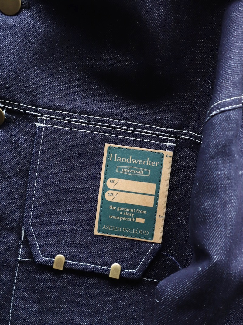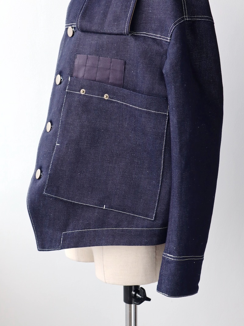 前身頃にはメモ帳が入るビッグサイズのポケットがあり、フラップをめくると4つのペン挿しがあらわれます。職人のための服をテーマにするHandwerkerならではの、実用性に長けたディテールにて、③も解決です。