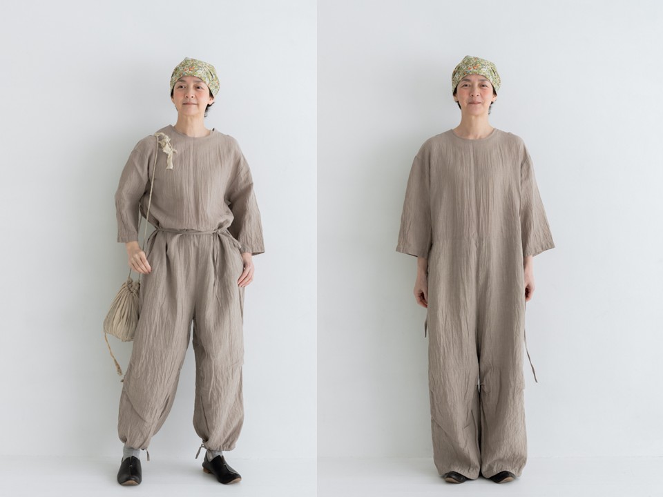 袖ありタイプのベースにしたのは「Laboratory」のコンビネゾン。背中のあきや、ネックライン、ポケットやサイズ感を変えて、1枚でも着やすいよう、ほどよくゆとりのあるデザインにしています。そして名前のとおり、紐を使ってアレンジが楽しめるコンビネゾン。ウエストの紐と裾の紐を結んだり緩めたりすることで雰囲気を変えることができます。