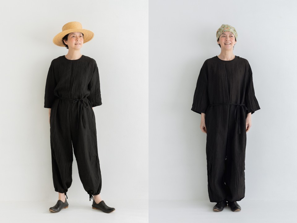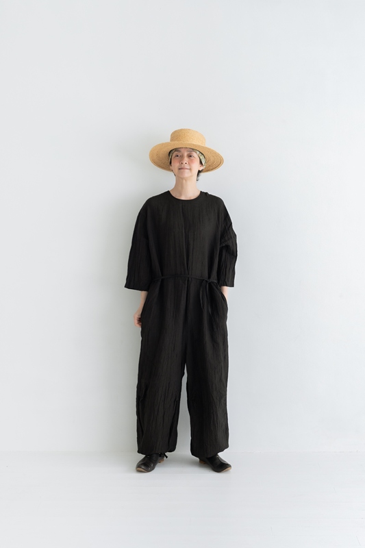 次に、色違いのブラックを着てみました。全体的にゆったりとしたシルエットですが、ウエストに紐をつけることで表情を変えられるようにしています。生地にはシャリ感があって夏にぴったり。