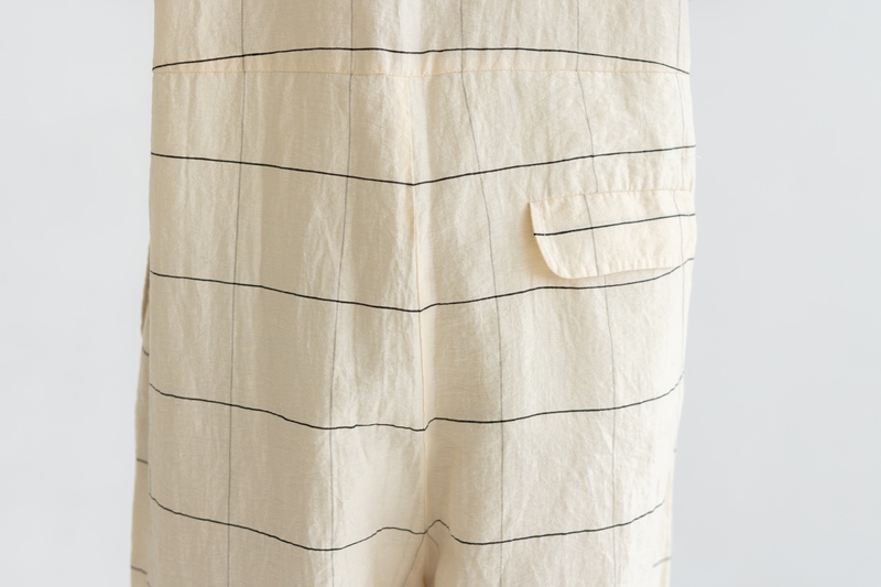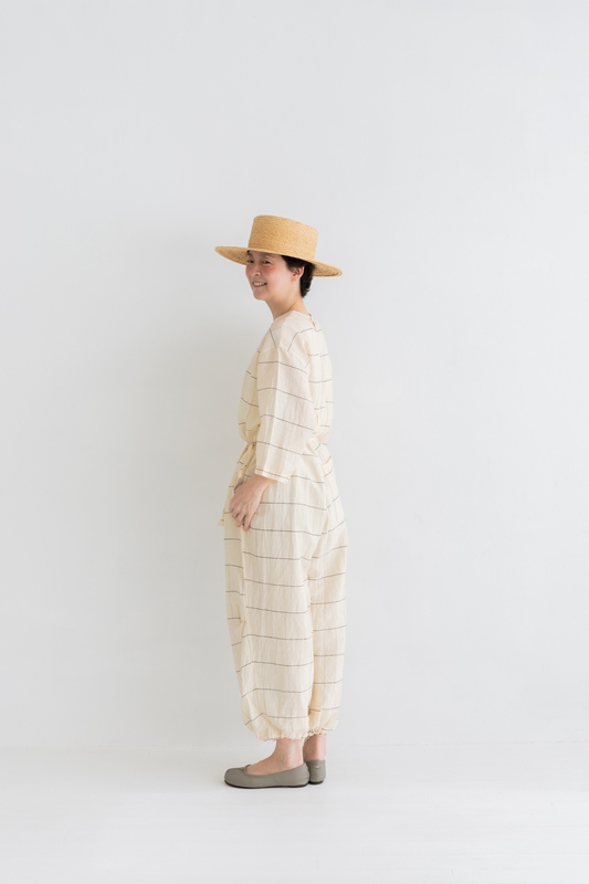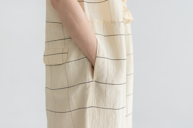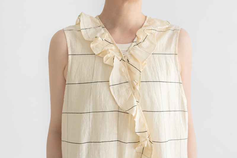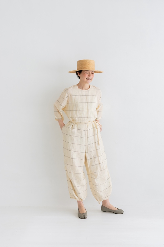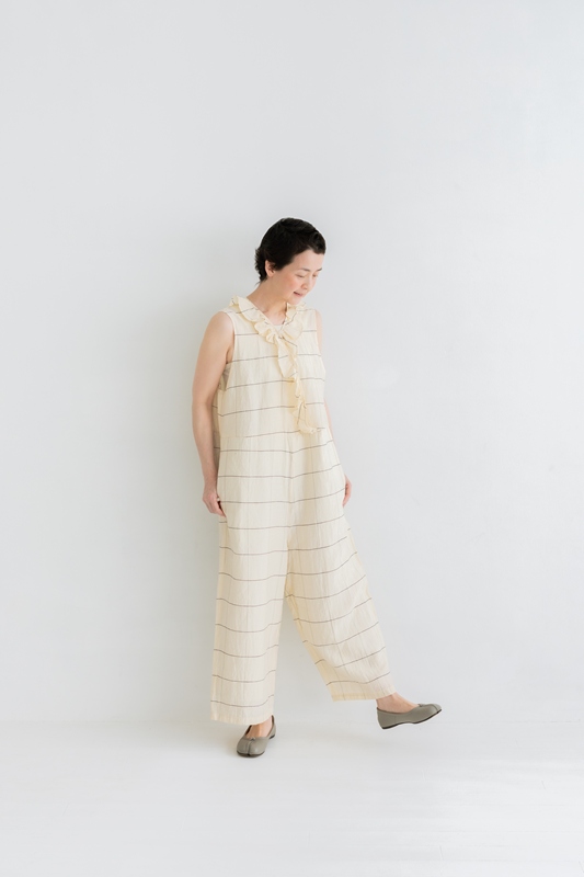 まずは【ノースリーブフリルコンビネゾン】をご紹介します。こちらはチェック柄のみの展開です。ベースにしたのは、「Gauze#」のコレクションにあったコンビネゾン。「もう少しこうだったら」と思うところを相談させてもらいながら、シルエットやバランスを少し変えて今回の形が出来上がりました。
