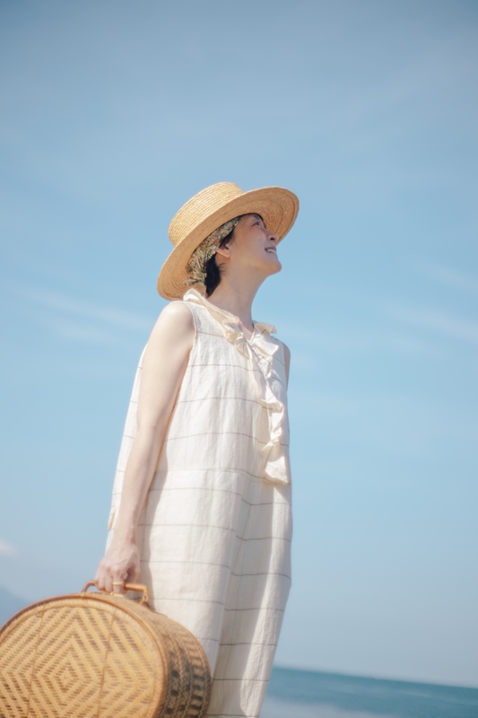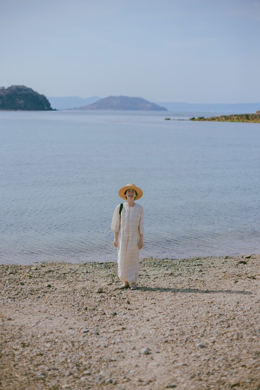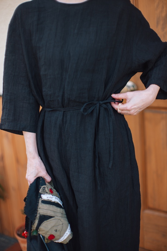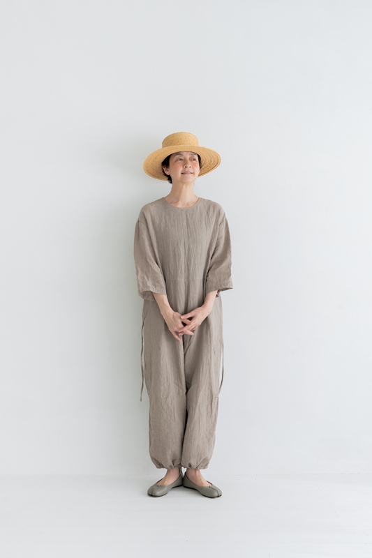 ウエストの紐は垂らして、裾をキュッと結ぶアレンジで着てみました。グレージュの色味もやさしいでしょう。出来上がってきたとき、「好きな感じ〜! 早く着てみたい!」とすぐに全色試着しました(笑)。