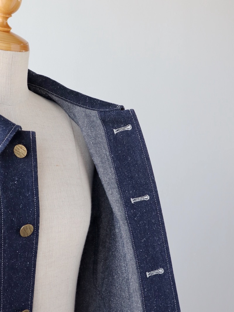 エイジング加工を施し、風合いと手触りを格上げしたボタン。強度が求められるボタンホールの縫製は、特に美しく仕上げられています。