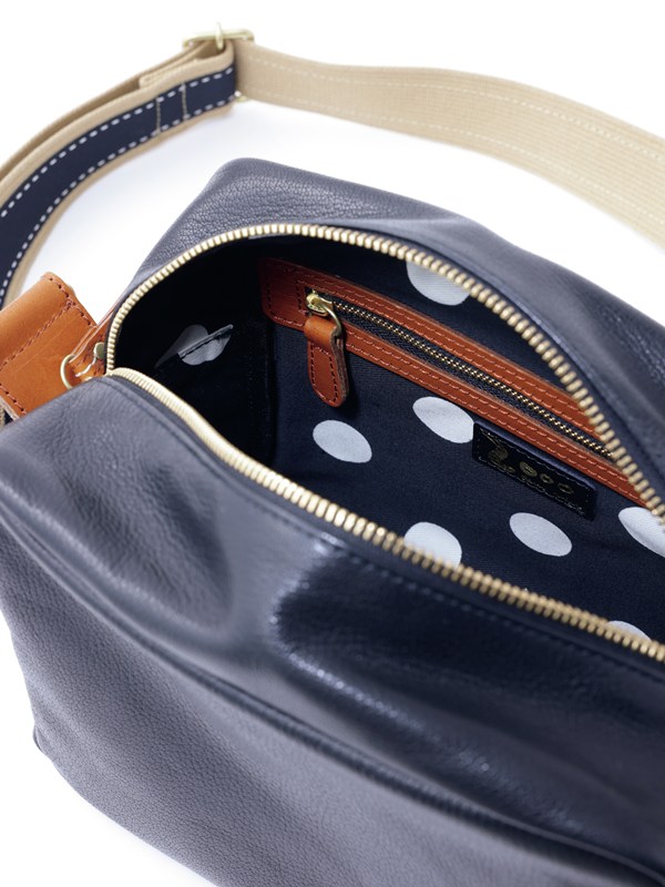 内側にはドット柄の生地があしらわれ、内ポケット&外ポケットも装備。ストラップには牛革のループつき。ブラック×イエロー、ブラウン×ブルーの小気味よい配色に。