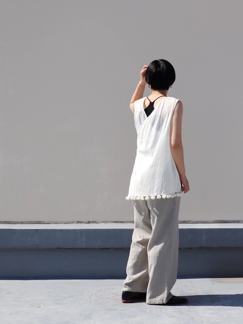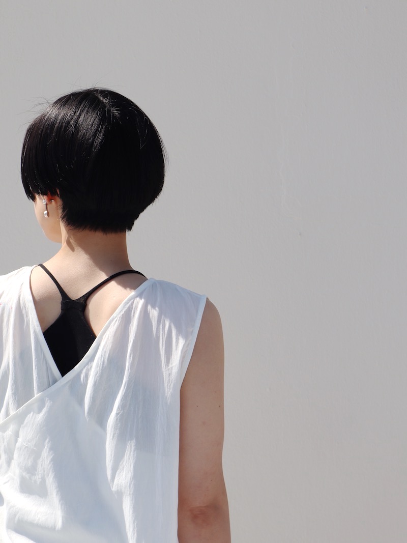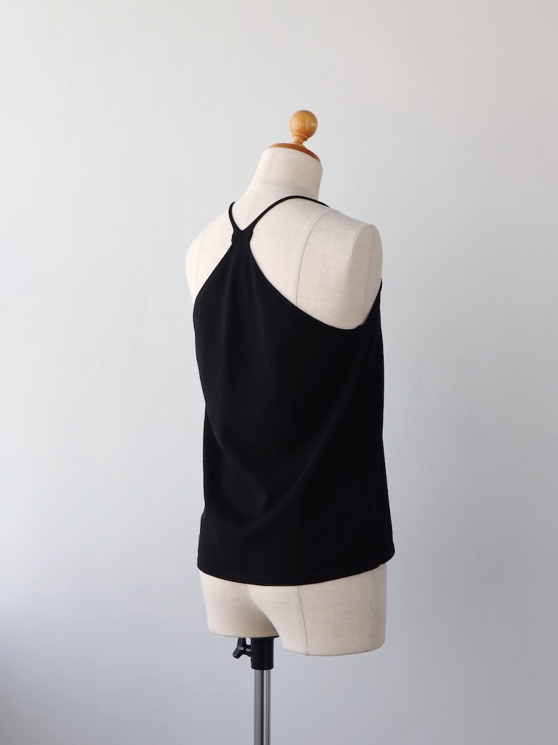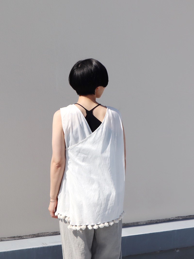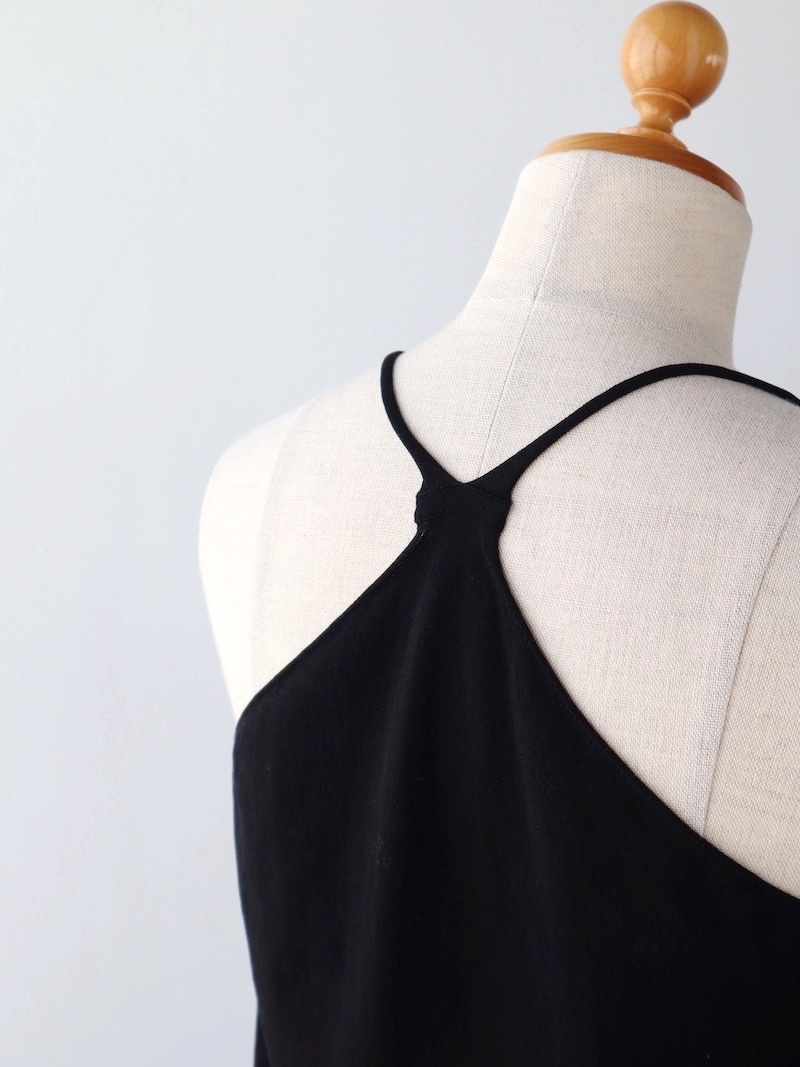 背面のクロスデザイン。チラッと見えてしまってもいい、いやむしろ見えるようなトップスを選びたくなる、シビれるディテールです。