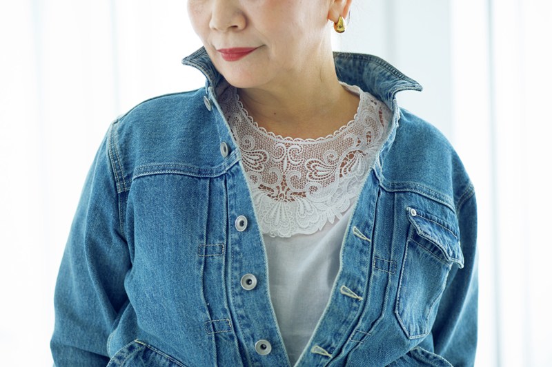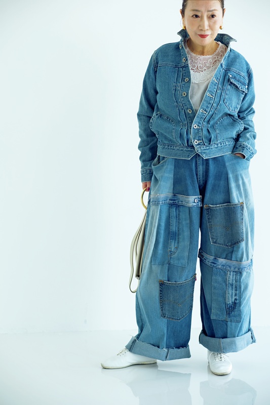 迫力のあるデニムのワイドパンツは、古着屋さんで見つけたもの。Gジャンは「ヴァンブラン」。“デニムonデニム”は、カジュアルになりすぎないよう、インナーにインポートレースを使った「ボンビュータン」のブラウスを。
