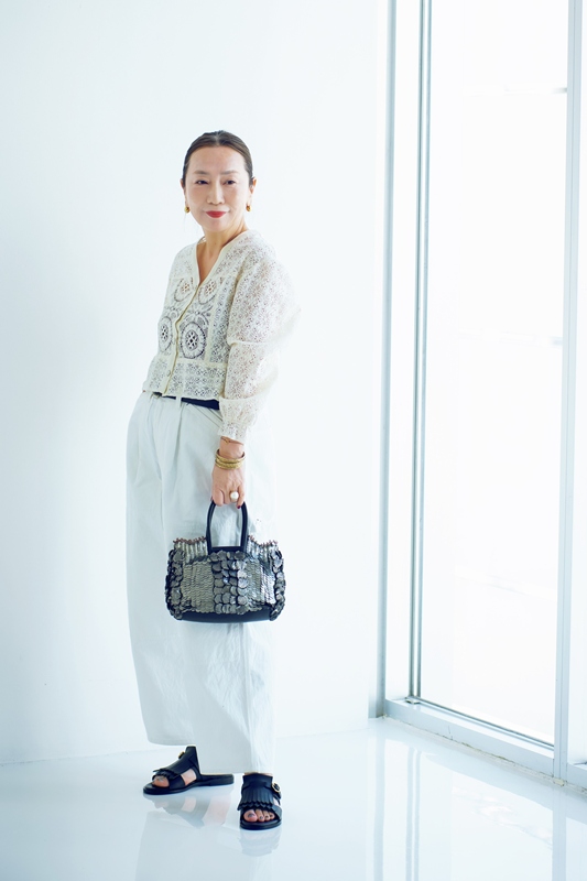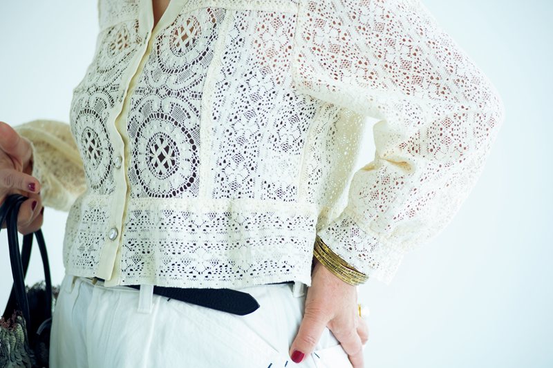 「ハバーサック」の白いパンツに、「ボンビュータン」のクルーニーレースのブラウスを合わせて。微妙に違う白を重ねて陰影をつけると、さわやかなだけでない大人の白のレイヤードに。