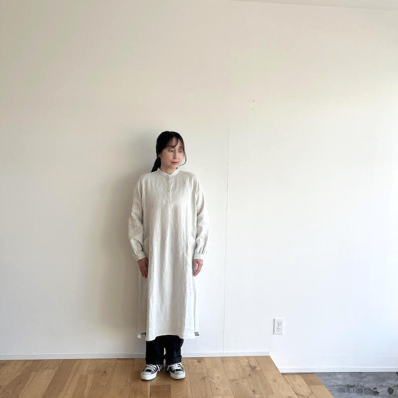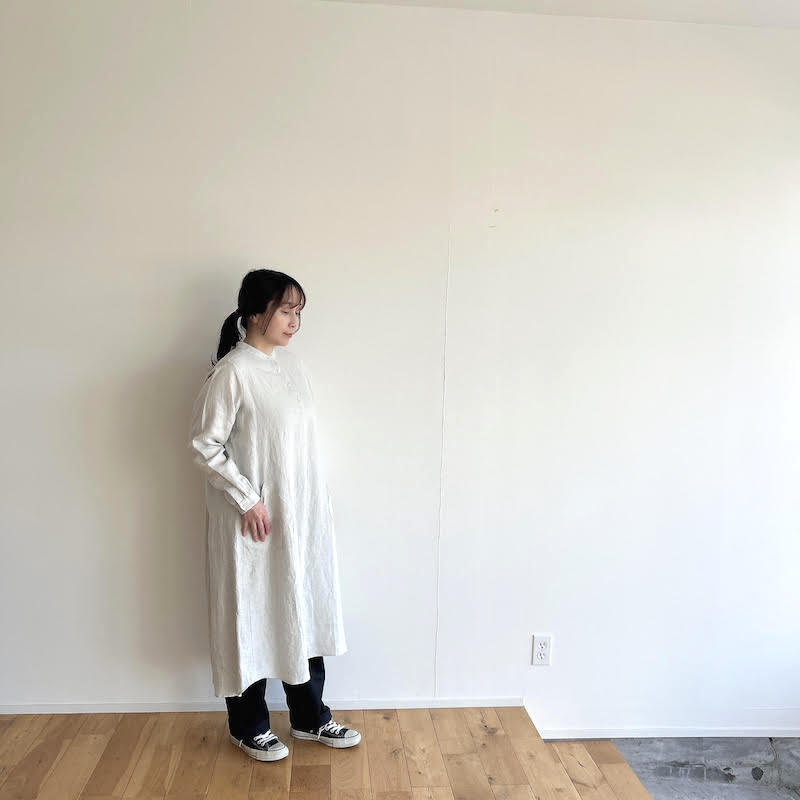 スッキリとした首元のスタンドカラーに、丸みを帯びた女性らしいシルエットが特徴的で、洗いのかかった柔らかく、ふんわりとした風合いのリネンがよく合うワンピースですね。