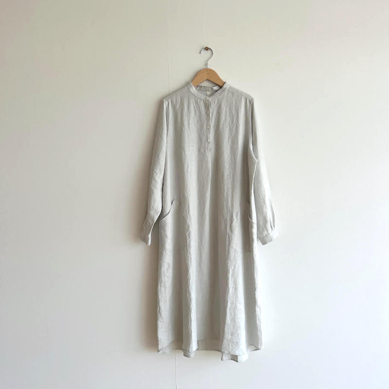 COMMUNEのシャツは裁断から、丁寧な縫製、ボタン付けまで全て手作業で作製されています。こちらのプルオーバーワンピースも定番の型なんですが、生地をリネン(ライトグレー)に変更してcrane別注として作っていただきました。