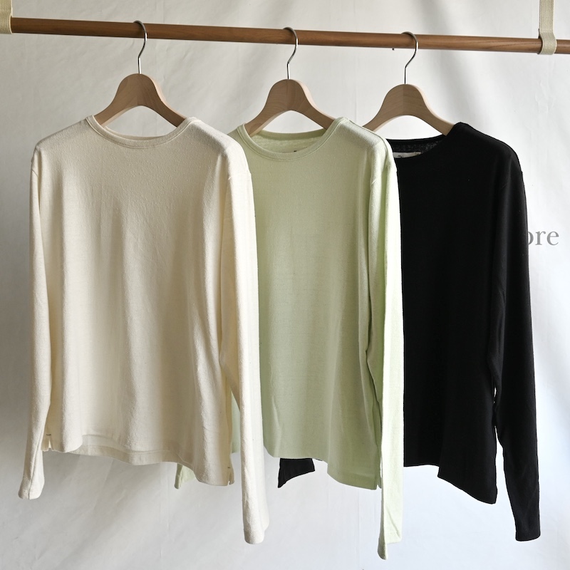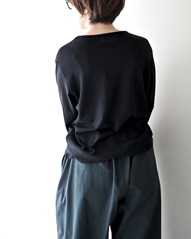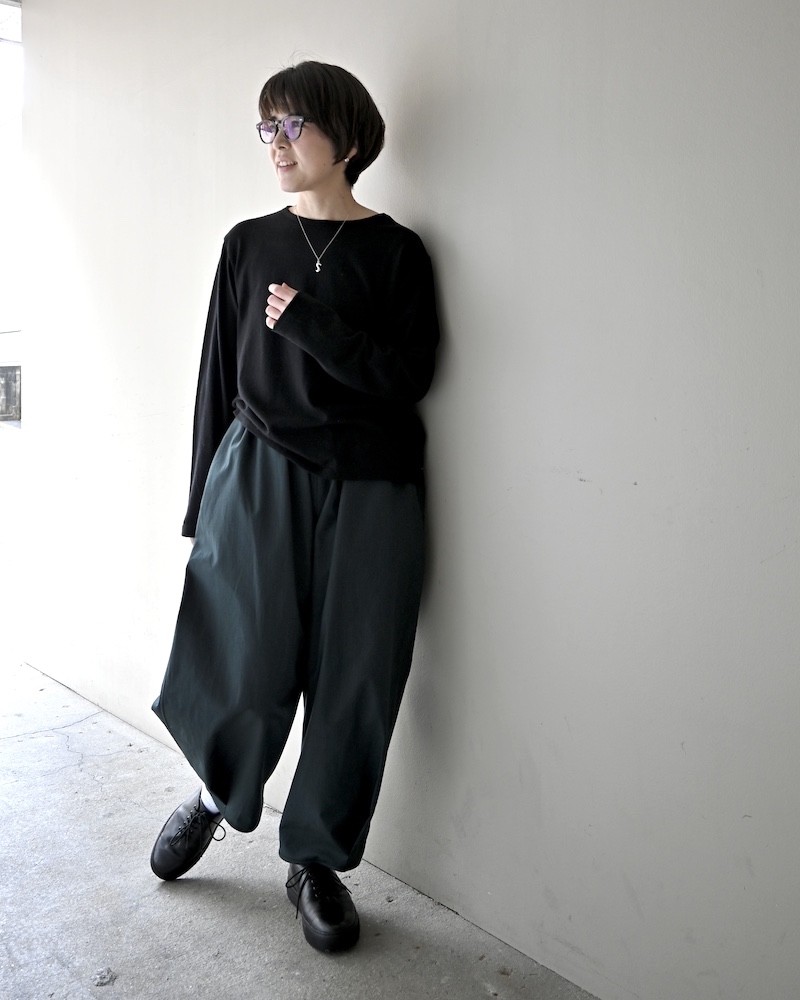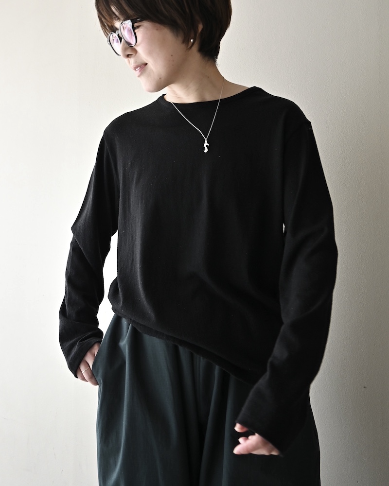 ブラックは珍しいグリーンの色味に惹かれた’sugiwai’のパンツと合わせてメンズライクに。やわらかな素材感とネックラインがやや横に広がるような絶妙なラインで、キリリとしたスタイルの中にもほんのり女性らしいニュアンスが加わります。大人のTシャツスタイルにはどこかきれい目な要素が必要のように思います。カジュアルさ控えめに身につけられるロンTは貴重ですよね。