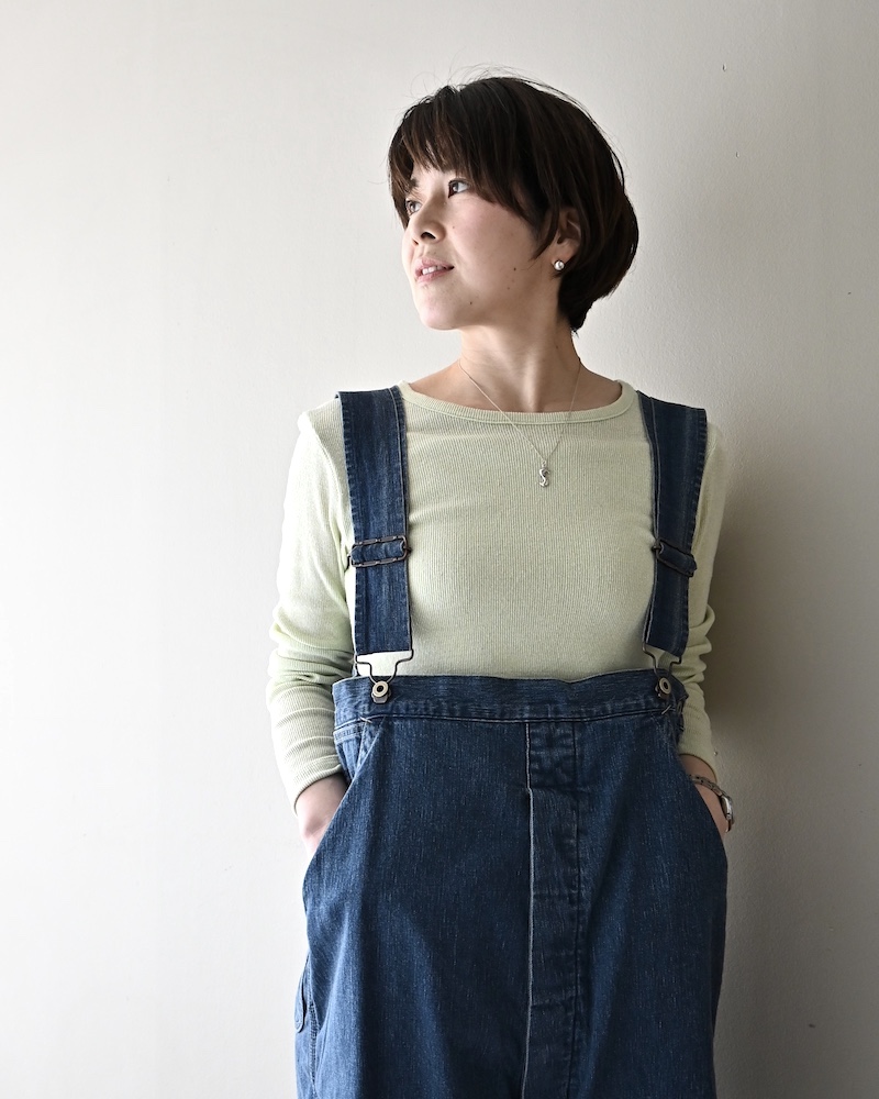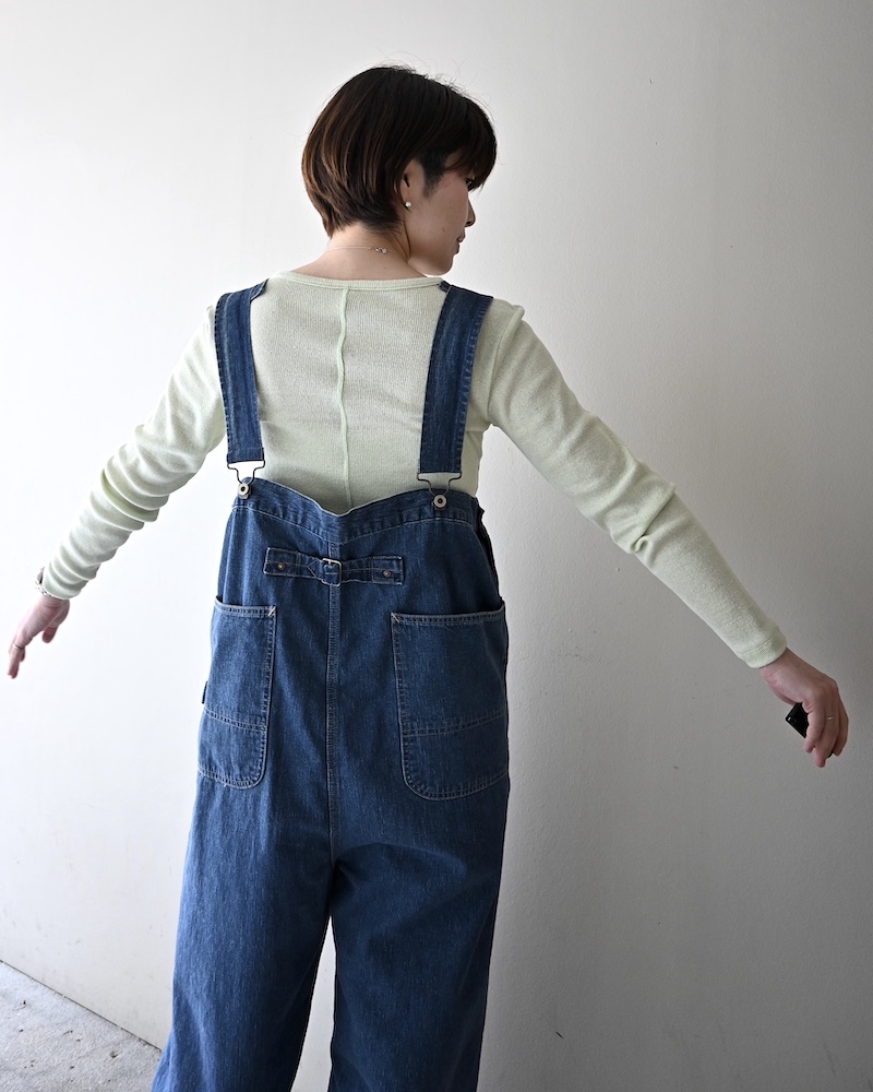 伸縮性が良いけれど、ピッタピタ!にならず緩やかなフィット感ですので、一枚でももちろんおすすめ。春の気分にもぴったりなミントカラーを「なんとかわいい!」と、色んな理屈を一気に飛び越え一目惚れした‘Luvourdays’のデニムオーバーオールと合わせてみました。ずっと憧れてはいるものの、年齢とともにどんどん挑戦を難しく感じ出してきたオーバーオールでしたが、このバランスなら着られそう。たっぷりボリュームのあるボトムスと合わせたい時、ワンピースやサロペット、ベストなどとのレイヤードですっきり見せたい時など活躍してくれそうです。後ろ姿はシームがアクセントになってくれています。