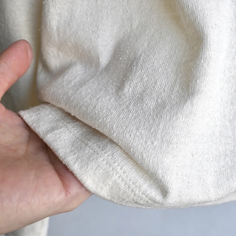 優れた吸湿・放湿性、保温性があり、夏は涼しく、冬は暖かいという機能が備わる天然素材シルクを、より身近に日常使いできるものにしたいという思いからスタートし、信頼できる奈良県のニッターさんとともにつくりあげた’me.’のオリジナル素材。太さが不均一な紬(つむぎ)糸を破れずに風合い良く編み立てるのは、熟練の技術と経験を持つニッターさんにとっても大変なご苦労があったようで、初めての質感の生地を安定的に編み出しができるまで何度も何度もやり直しながら誕生に至ったそうです。