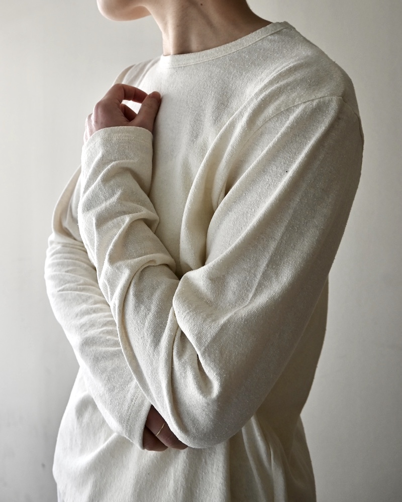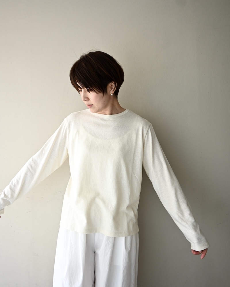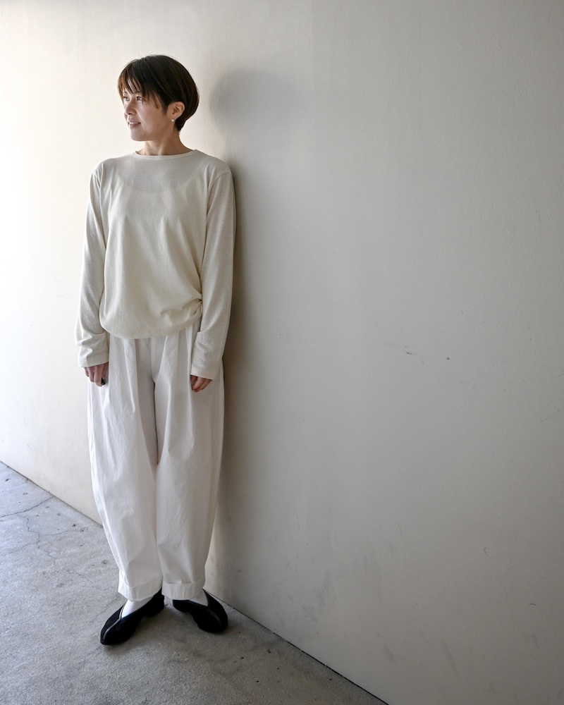 アイボリーはホワイトのパンツと明るく爽やかに。ネップ感あるナチュラルな風合いともマッチする色味は表情もふんわりやさしくしてくれるようですね。着るとなんとなくですが光沢も感じられ、Tシャツだけどニットのような上品な雰囲気があります。