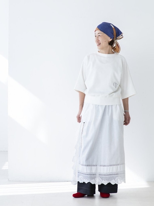 どんなボトムもとも相性のいいホワイト。デニムにヴィンテージのレーススカートを重ねた大人の古着ミックスコーデに合わせて、スカーフを頭に巻いてキリリとした味付けを。