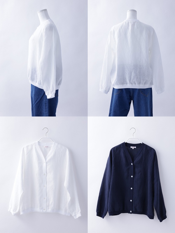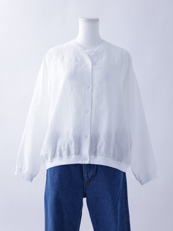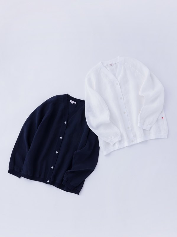 兵庫・苦楽園の人気セレクトショップ「パーマネントエイジ」は、ベーシックな中にも“今”を感じさせるオリジナルアイテムに毎シーズン注目が集まります。今季のおすすめは、軽やかなフレンチリネン素材のカーディガン。シャツのようにさらりとはおれて風通しもよく、春夏の温度調整にもってこいです。「シンプルなデザインですが、リブ部分はコットン素材を使用していて、さりげない異素材の組み合わせがアクセントになっています」と桃井さん。