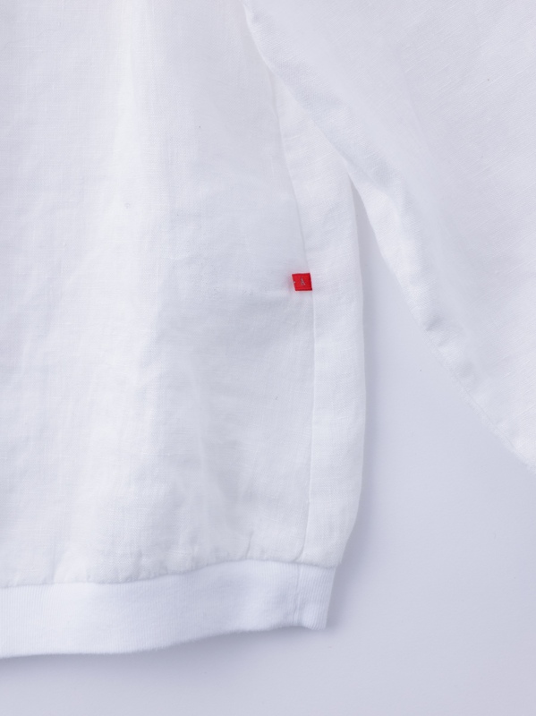 さらりとした肌ざわりが心地いいフレンチリネン素材。脇にあしらわれた赤いブランドタグもポイントに。
