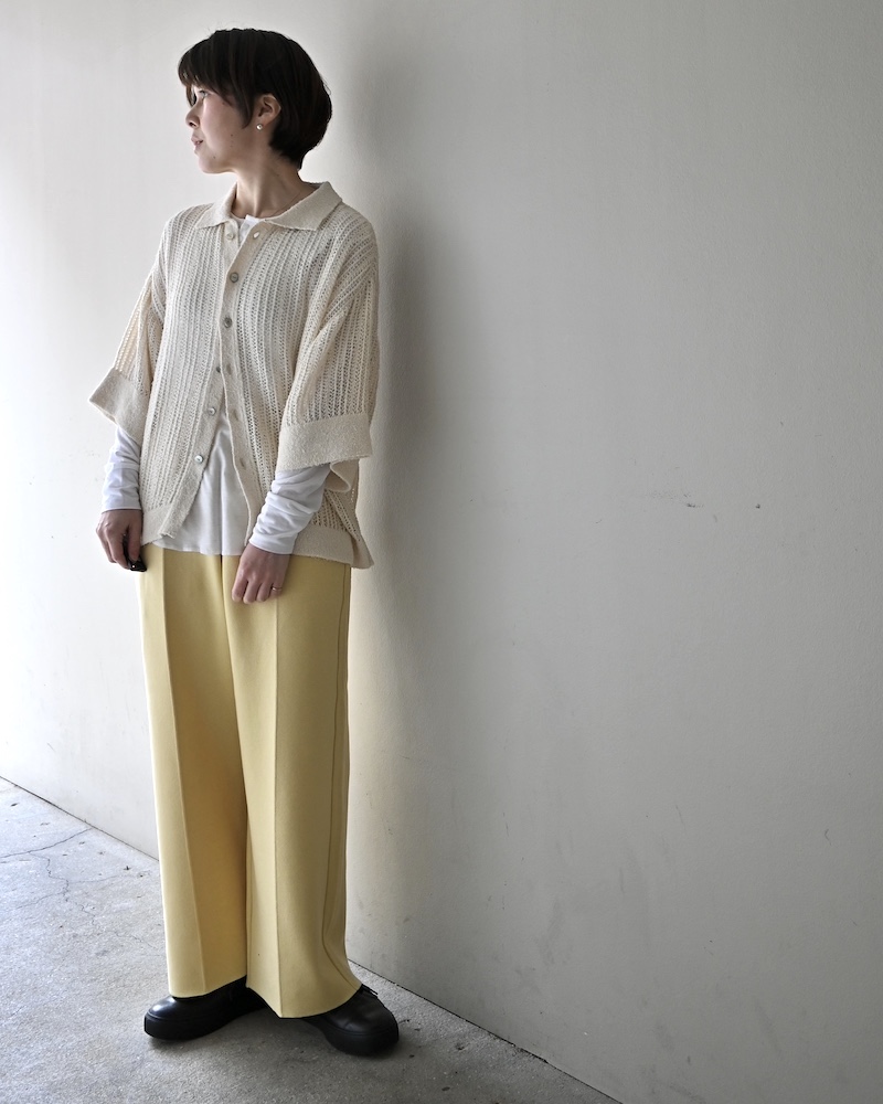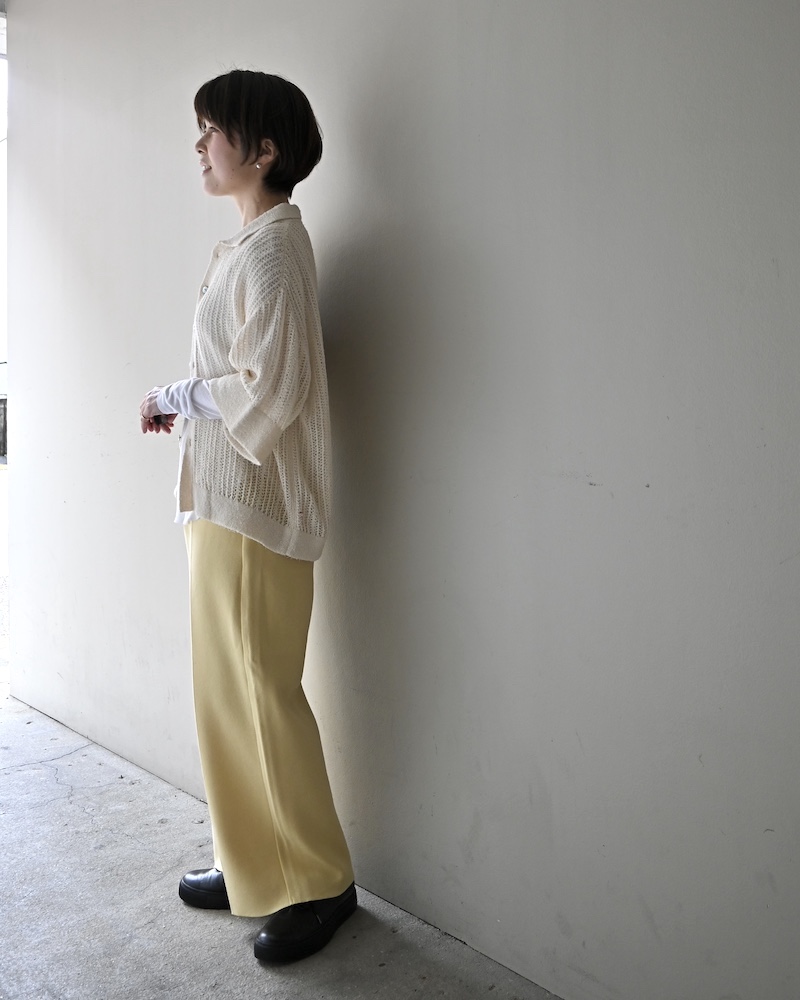 EGGという名前もかわいらしいイエローのパンツは、同じYULAのポロニットと合わせてやわらかな雰囲気を楽しみたくなりました。ニットの上下でもルーズになりすぎないのはパンツのセンタープレスがキリッと効いているからだと思っていますが、よく見るとこの折り目、プレスではなく編み地でかたち作られているんです。履いても洗っても消えないという細やかな工夫、嬉しいです。