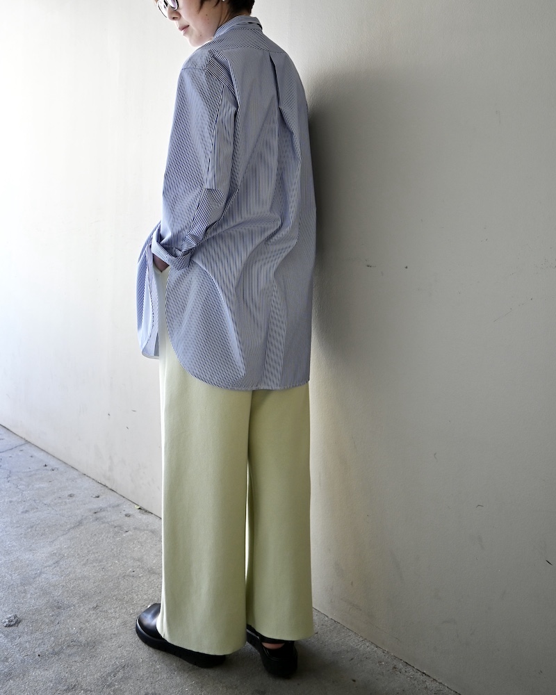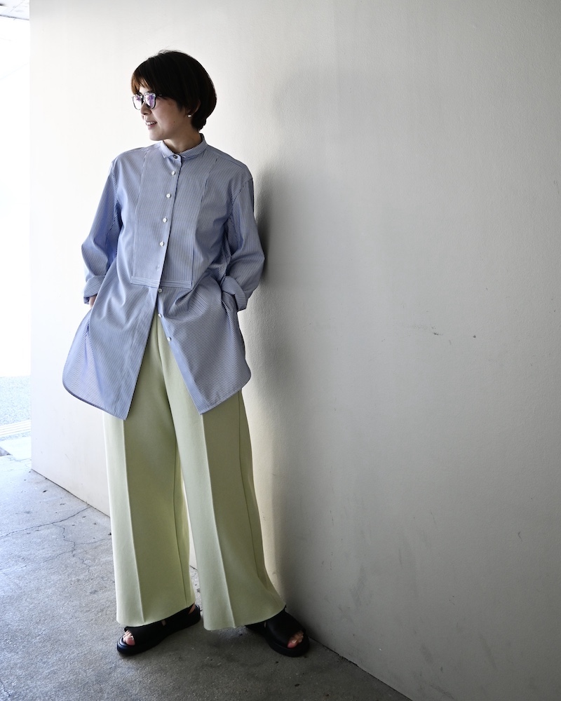 MINTは、久々に心惹かれたストライプ柄のシャツと爽やかなカラーリングのコーディネートに。長い着丈のシャツだとお尻まわりがカバーできて安心感がより増しました。ニットパンツのリラックス感には憧れるけど、部屋着っぽく見えてしまわないかという心配が拭えない…という方は、布帛(ふはく)のシャツやワンピースと組み合わせていただくと取り入れやすいのではないかなと思います。